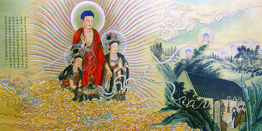 〖 释义 〗舍利弗,众生只具备少许善根、福德、因缘是不得往生极乐国的。假使有善男子或善女人听到阿弥陀佛,能至诚恳切地执持名号,若一天、若两天、若三天、若四天、若五天、若六天、若七天,能一心不乱;等到寿命终了时,阿弥陀佛就会同其他圣众现身在他(她)面前,使该人临终时心不颠倒,即得往生阿弥陀佛极乐国土。