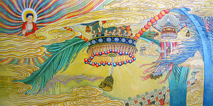 〖 释义 〗舍利弗,极乐国中还有一种清妙的声音,这声音是微风过处,吹动许多宝树和许多珍宝罗网所发出来的微妙音声,好像是千百种音乐同时并作,使人听了也会不期然地发起念佛念法念僧的心。舍利弗,极乐国成就了如上所说的功德庄严。