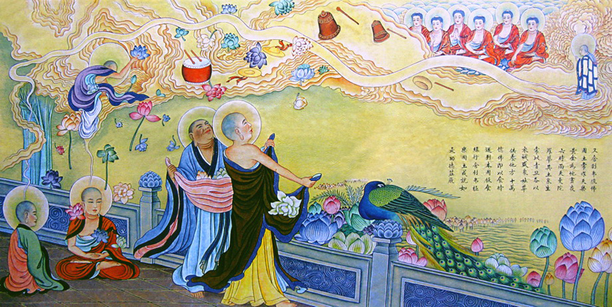 〖 释义 〗舍利弗,我再告诉你,在极乐国里,空中时常发出天乐,地上都是黄金铺饰的。有一种极芬芳美丽的花称为曼陀罗花,不论昼夜没有间断地从天上落下,满地缤纷。那个国里的众生每天早晨起来,用他们的衣祴盛装各种天华,送到十方世界供养诸佛;到吃饭的时候再回来。饭后随意地散步行道。舍利弗,极乐国成就了如上所说的功德庄严。